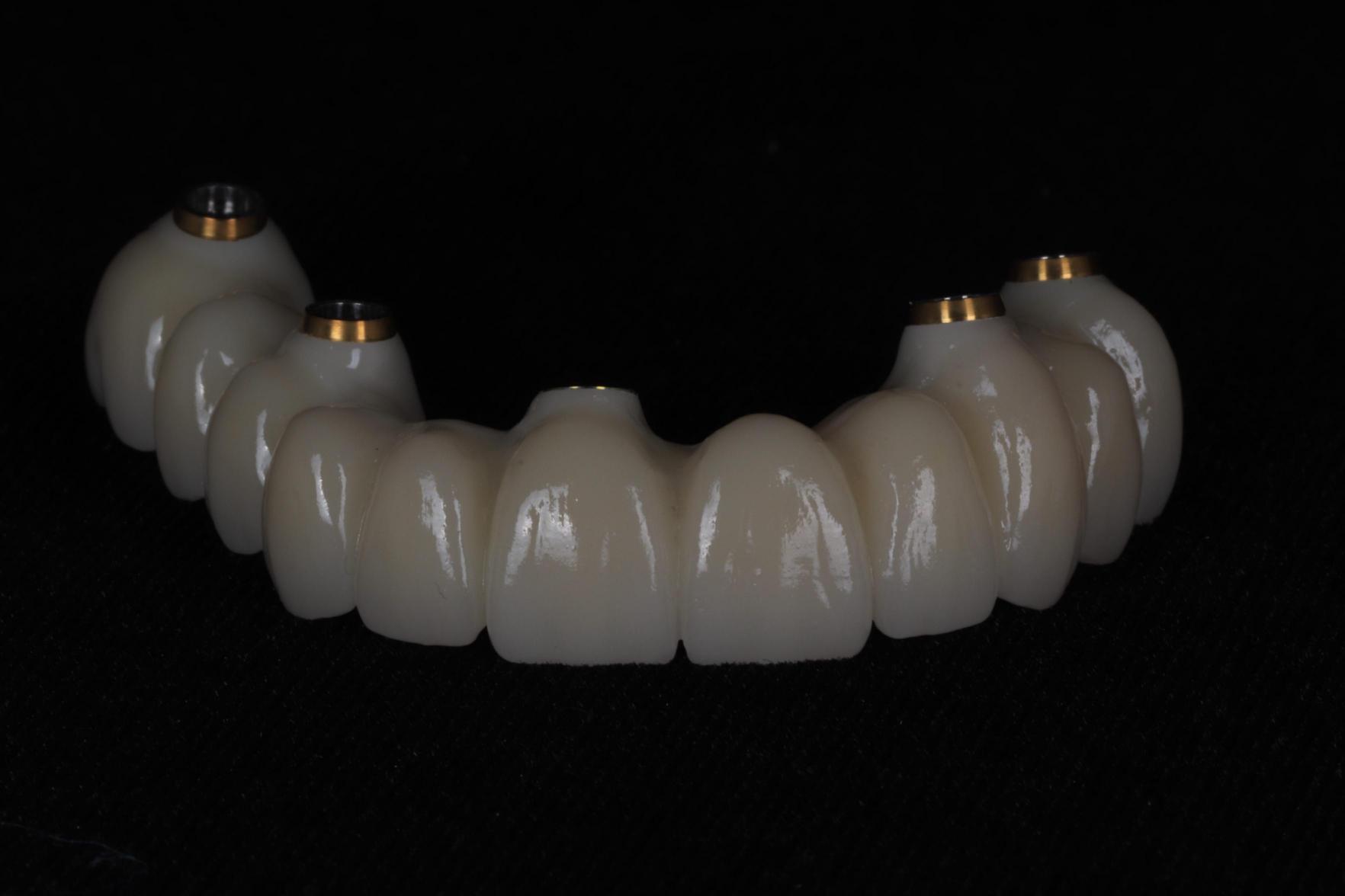Fixed, non-removable full-arch tooth replacement supported by strategically placed implants.